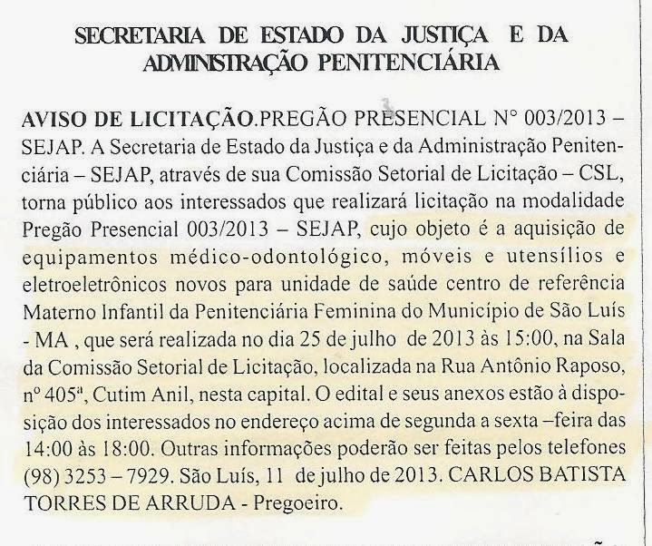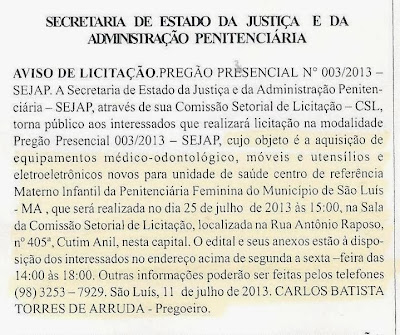 Os órgãos de fiscalização e controle precisam verificar também se foram instalados “equipamentos médico-odontológicos, móveis e utensílios e eletro-eletrônicos novos para a unidade de saúde centro de referência Materno Infantil da Penitenciária Feminina”, conforme anuncia o pregão 003/2013, publicado no Diário Oficial em 22 de julho.