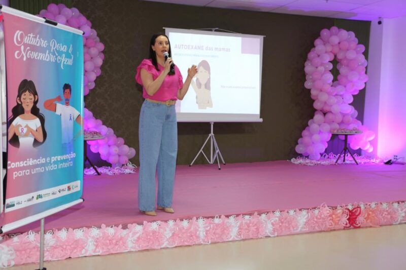 A radiologista mamária Dra. Priscila Pinho falou sobre prevenção e combate ao câncer de mama; em seguida, aconteceu uma Oficina sobre a Sintomalogia do Câncer de Mama, com explicações sobre o Autoexame. Lembrando que apesar de raro entre homens, o câncer de mama também acontece entre o público masculino em menor proporção.