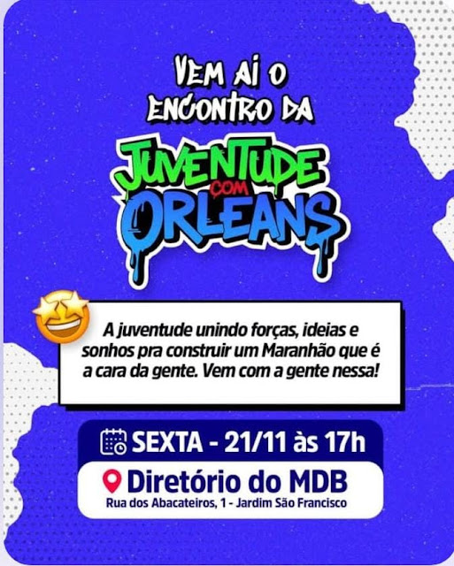 Por meio da união de forças políticas, novas ideias e sonhos coletivos, a Juventude dos partidos aliados ao governador Carlos Brandão promoverá o primeiro Encontro da Juventude com Orleans. Visando dar continuidade na construção dos relevantes avanços no Maranhão, o evento ocorrerá nesta sexta-feira, 21 de novembro, às 17h, na sede do Diretório do MDB, na rua dos Abacateiros, no Jardim São Francisco, em São Luís. Organizam o Encontro integrantes da Juventude dos partidosPT, PSDB, PDT, MDB, PODEMOS, REPUBLICANOS, CIDADANIA E UNIÃO BRASIL, aliados da base do atual governo estadual.
