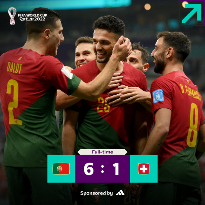 Portugal se tornou a última seleção classificada às quartas de final da Copa do Catar. Os ibéricos golearam a Suíça por 6 a 1, na tarde desta terça-feira (6) no Estádio de Lusail. Com este resultado, Portugal enfrenta Marrocos, a partir das 12h (horário de Brasília) do próximo sábado (10), no Estádio Al Thumama em busca de uma vaga nas semifinais da competição.