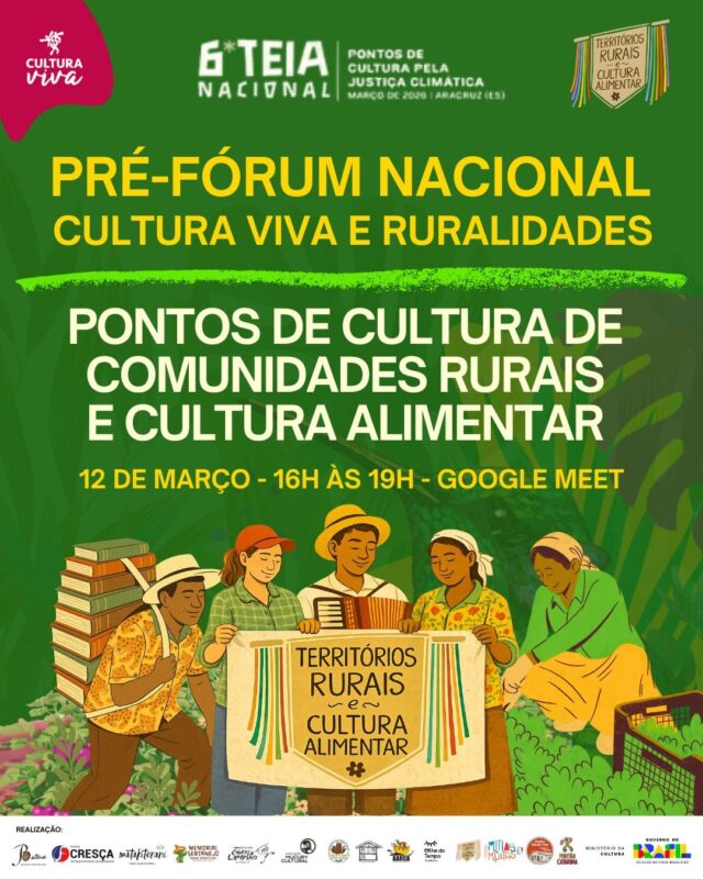 No próximo dia 12 de março, das 16h às 19h, será realizado, via Google Meet, o Pré-Fórum Cultura Viva e Ruralidades – Pontos de Cultura de Comunidades Rurais e Cultura Alimentar. A iniciativa integra o processo preparatório para o V Fórum Nacional e a 6ª Teia e tem como foco ampliar a incidência das ruralidades no âmbito da Política Nacional Cultura Viva.