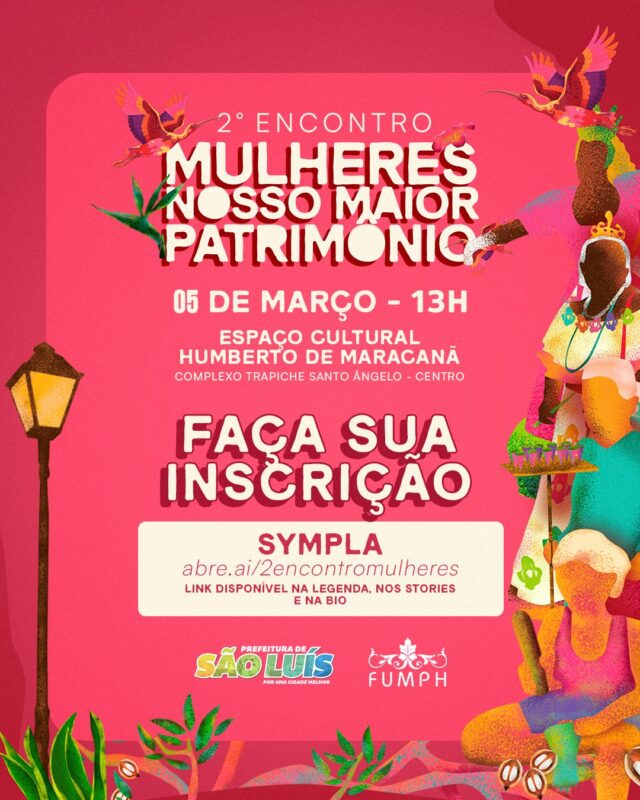 Com o tema “Mulheres em Cena: Protagonismo Feminino na Cultura”, o encontro será realizado no Complexo Trapiche Santo Ângelo – Espaço Cultural Humberto de Maracanã, reunindo mestras, pesquisadoras, gestoras públicas, artistas, educadoras e lideranças comunitárias que atuam na cultura de São Luís. As inscrições para participação no encontro serão gratuitas e realizadas por meio da plataforma Sympla, e estarão disponíveis até 05 de março de 2026, através do link https://abre.ai/2encontromulheres , permitindo ao público garantir previamente sua participação nas atividades e mesas de debate. Para acesso ao evento, será necessário