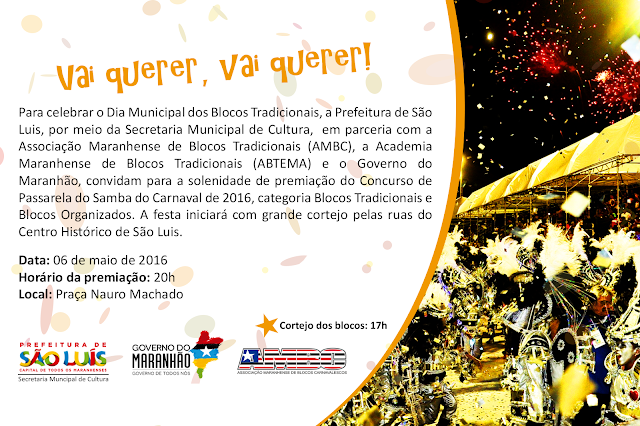 PREMIAÇÃO DO CARNAVAL 2016 – APENAS PARA BLOCOS TRADICIONAIS E BLOCOS ORGANIZADOS .- DIA O6 DE MAIO, NA PRAÇA NAURO MACHADO – PRAIA GRANDE – CENTRO HISTÓRICO DE SÃO LUÍS -MA