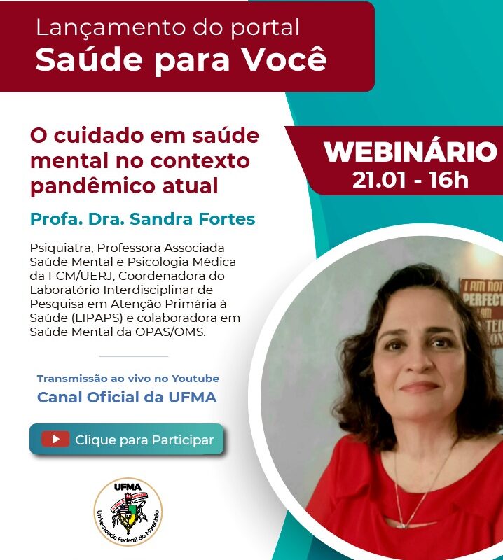 Para celebrar o lançamento do portal Saúde Para Você, a Universidade Federal do Maranhão promoverá, nesta sexta-feira, 21, às 16h, o webinário com o tema “O cuidado em saúde mental no contexto pandêmico atual”, ministrado pela professora da Faculdade de Ciências Médicas da Universidade do Estado do Rio de janeiro (FCM/UERJ), Sandra Fortes. O evento será transmitido ao vivo no Canal Institucional da UFMA, no Youtube.