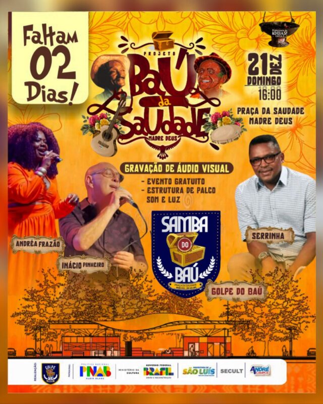A proposta do evento é revisitar a memória afetiva e musical do bairro, reunindo comunidade, artistas e admiradores das manifestações culturais locais. A programação contará com palco em formato 360º e ambientação inspirada nas tradições da Madre Deus. O destaque fica por conta do Samba do Baú, que terá participações de Serrinha, Andréa Frazão e do interprete da Companhia Barrica, Inácio Pinheiro, artistas reconhecidos por sua trajetória na música maranhense.