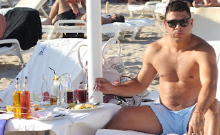 A forma física do nosso ex-camisa 9 deixa bem claro que esporte agora, só no escritório. Curtindo sob do sol quente do verão espanhol, hidratação é fundamental. Mas nada de Gatorade, ao que parece pela foto, sobre a mesa de Ronaldo a preferência é por refrescos.