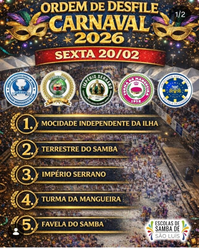 GeralSaiu a Ordem de Desfile do Carnaval de Passarela 2026! Desfile das dez escolas de samba acontecerão na sexta-feira, 20, e no sábado, 21 de fevereiro! 26/01/202626/01/2026