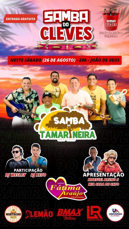 Está confirmada a presença do Grupo Samba da Tamarineira, no próximo sábado, dia 26, na primeira edição do Samba do Cleves, no bairro João de Deus. A programação terá início às 20h, com o DJ Wesley e Beto, duas atrações da festa, que conta com o apoio exclusivo da vereadora de São Luís, Fátima Araújo (PCdoB). A apresentação do samba será de Maxsuel Bruno e Mia Cara de Gato.