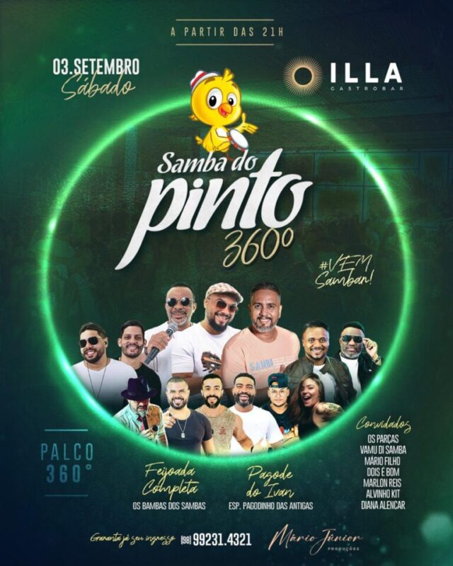 São Luís – Neste sábado tem “Samba do Pinto” no Illa Gastrobar (Calhau). A programação começa às 21h. Segundo o idealizador do projeto, Mário Júnior, será uma linda roda de samba e pagode no formato 360°.