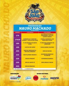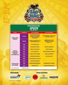 A programação completa desses arraiais, até o dia 12 de junho, pode ser conferida no site cultura.ma.gov.br e nas redes sociais oficiais da Secma. O São João do Maranhão 2022 é realizado pelo governo do Estado do Maranhão, via Secretaria de Estado da Cultura, com apoio cultural da Equatorial Energia, Supermercados Mateus, Guaraná Jesus e Coca-Cola.