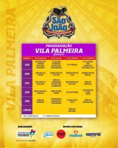 Na Vila Palmeira, a programação do dia 9, que inicia às 19h, terá: Quadrilha Junina Explode Coração, show Brasas do Forró, Cacuriá do Basson, Boi Lendas e Magias (orquestra), Boi de Pindaré (baixada).