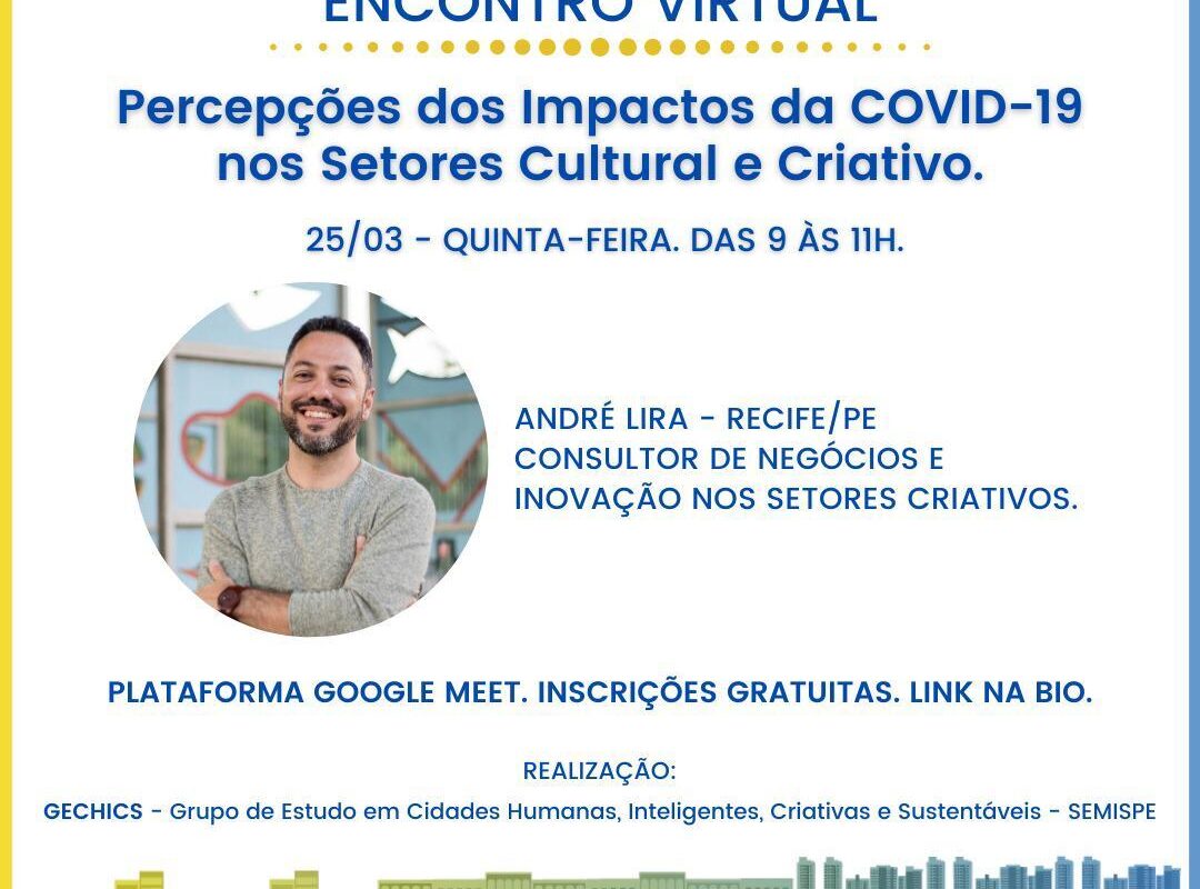 A Secretaria Municipal de Inovação, Sustentabilidade e Projeto Especiais (Semispe) promoverá o encontro virtual ‘Percepções dos Impactos da Covid-19 nos Setores Cultural e Criativo’. O evento é uma ação do Grupo de Estudos sobre Cidades Humanas, Inteligentes, Criativas e Sustentáveis/Semispe (GECHICS) do Município.