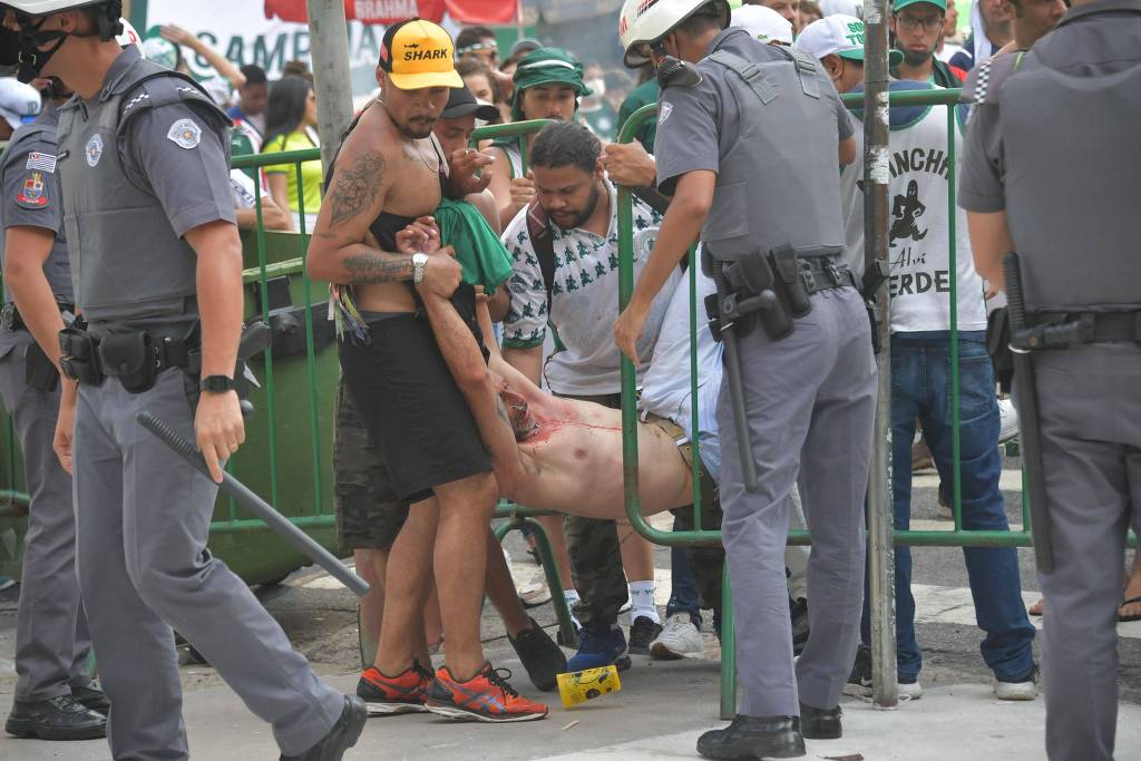 Imagens exibidas pela TV Bandeirantes mostram brigas entre palmeirenses. Em uma das cenas, um torcedor leva um soco, cai e recebe chutes na cabeça.