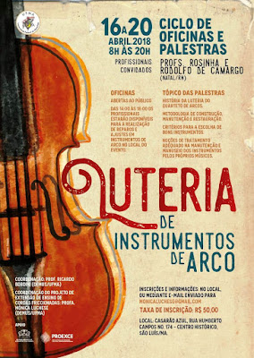 A taxa de inscrição é de R$ 50,00 (cinquenta reais). Mais informações no local ou pelo email: monicaluchese@gmail.com. As oficinas e palestras serão ministradas pelos luthiers e musicistas Rosinha e Rodolfo de Camargo, radicados na cidade de Natal/RN. Vale lembrar que, no horário das 14h às 18h, os palestrantes estarão disponíveis ao público no local do evento para a realização de reparos e ajustes em instrumentos musicais de arco.