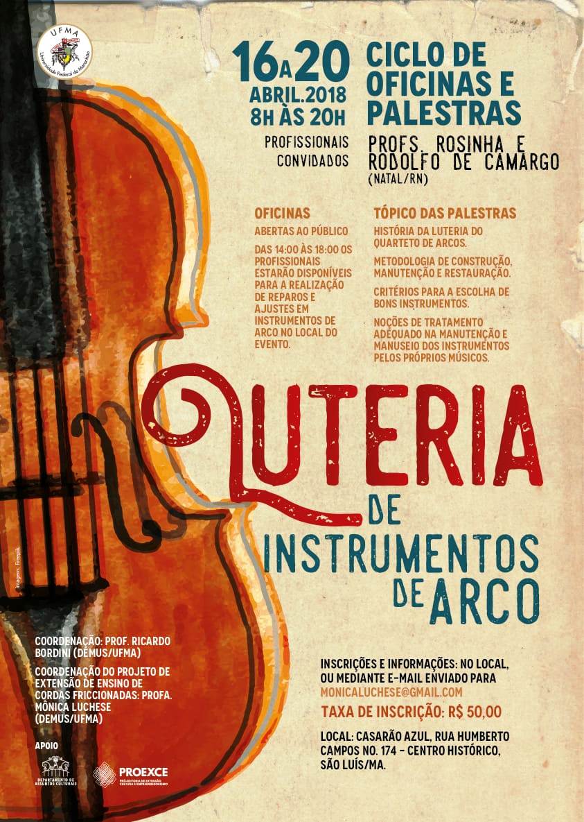 Coordenado pelo Professor Ricardo Bordini e pela Professora Mônica Luchese, do Demus/Ufma, no ciclo serão abordados em seu conteúdo programático os tópicos ‘a História da Luteria do Quarteto de Arcos’; ‘Metodologia de Construção’, ‘Manutenção e Restauração de Bons Instrumentos’, ‘Noções de Tratamento Adequado na Manutenção’ e ‘Manuseio dos Instrumentos pelos Próprios Músicos’.