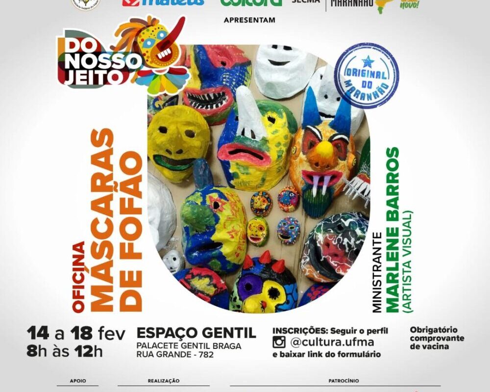 Com o objetivo de preservar uma das mais importantes tradições do nosso carnaval, a Universidade Federal do Maranhão (UFMA) promoverá a oficina de máscara de fofão no período de 14 a 18 de fevereiro. A ação faz parte do projeto Do Nosso Jeito, realizado pela Diretoria de Assuntos Culturais (DAC). As inscrições ocorrem até 8 de fevereiro pelo Google Forms. A turma será formada pelos 20 primeiros inscritos.