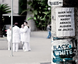 “Quer ser contaminado? Abrace alguém de jaleco” e “Atenção aderentes ao uso de jaleco nas ruas: vocês NÃO têm estilo” são algumas das 11 mensagens que começaram a ser coladas em postes há cerca de um mês.